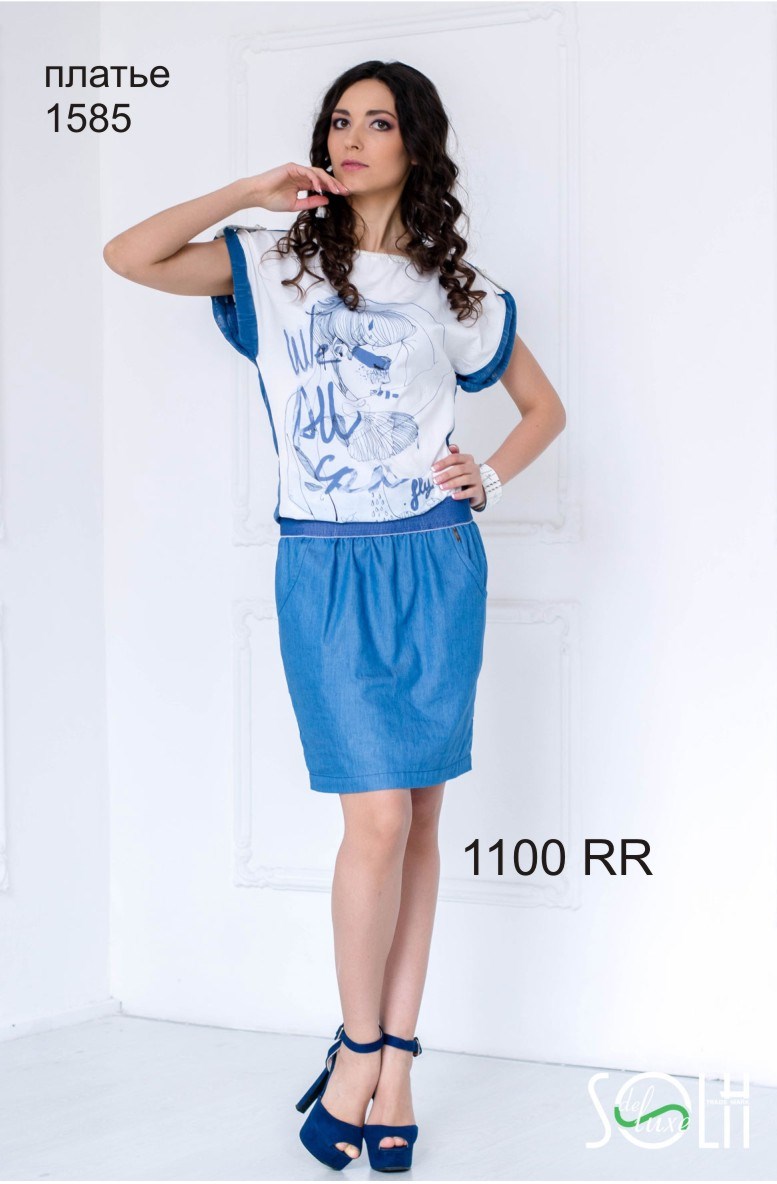 Легкое, модное платье из смесового шелка и джинсового коттона с оригинальным принтом по полочке.Верх соединен с низом через мягкую эластичную резинку под цвет джинсы. состав:верх-шёлк 17%,вискоза 15%,полиэстер 68% низ-коттон 100%