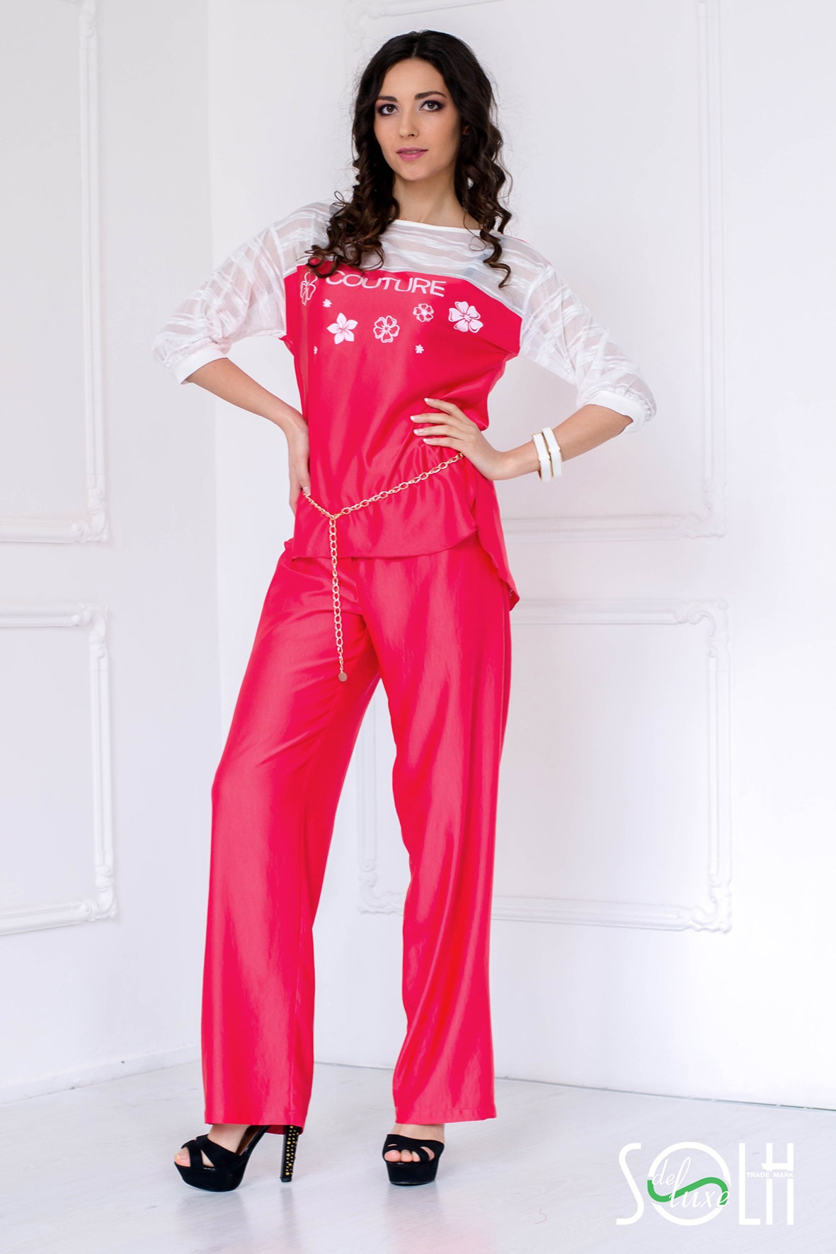 Элегантный брючный костюм из смесового шелка.В комплекте пояс-цепочка. состав ткани:шёлк 15%,вискоза 17%,полиэстер 68%