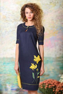 Платье женское из однотонного льна, полуприлегающего силуэта. Модель с короткими рукавами и диной чуть ниже колена. Изделие декорировано контрастными по цвету нитями. По переду платья располагается оригинальная аппликация в виде цветов и вышивки. Округлая горловина по переду застёгивается на две пуговицы.