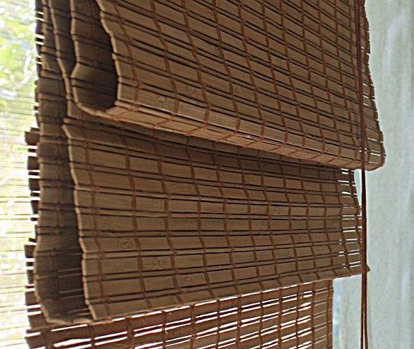 Бамбуковые шторы складываются при поднятии в горизонтальные складки, а при опускании полотнище расправляется, закрывая окно.