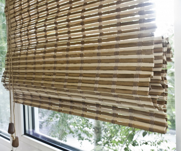 Бамбуковые шторы складываются при поднятии в горизонтальные складки, а при опускании полотнище расправляется, закрывая окно.