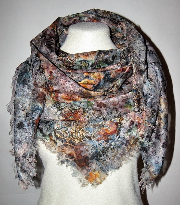 Абсолютная новинка на Российском рынке, эксклюзивная разработка наших дизайнеров - платок 2 в 1 изготовлен из равных частей хлопка и вискозы. Изготовлен по новейшей технологии, включающей в себя три этапа, каждый из которых сам по себе уникален : 1. Нанесение двусторонней трансферной печати. 2. Вытравка узора на ткани. 3. Нанесение "золотого" тиснения поверх рисунка. Слияние этих технологий позволило получить изделие, аналогов которому на сегодняшний день нет.