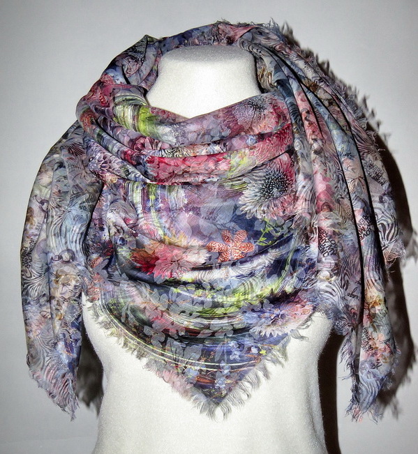 Абсолютная новинка на Российском рынке, эксклюзивная разработка наших дизайнеров - платок 2 в 1 изготовлен из равных частей хлопка и вискозы. Изготовлен по новейшей технологии, включающей в себя три этапа, каждый из которых сам по себе уникален : 1. Нанесение двусторонней трансферной печати. 2. Вытравка узора на ткани. 3. Нанесение "золотого" тиснения поверх рисунка. Слияние этих технологий позволило получить изделие, аналогов которому на сегодняшний день нет.