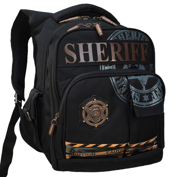 Рюкзак с двумя отделениями, передними, боковыми и внутренними карманами, карманом-пеналом, с карманом на лямке для мобильного телефона, укреплёнными жёсткими лямками и спинкой. Собачки на бегунках молнии изготовлены в виде ПАТРОНОВ ОТ АВТОМАТА И ПИСТОЛЕТА.