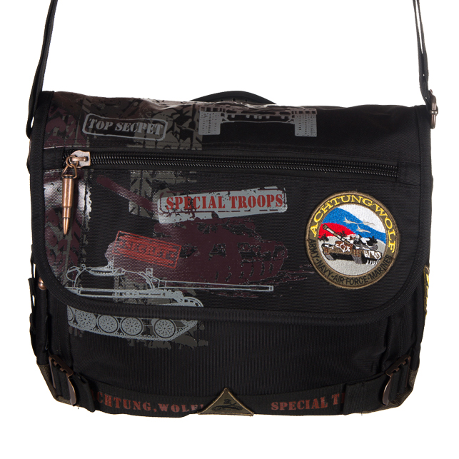 Дизайн в стиле "милитари" делает сумку ACHTUNG WOLF выбором мужественных и уверенных в себе личностей. Модель сшита из прочного и немаркого полиэстра неярких тонов, и отлично подойдет для повседневного ношения. Внутри имеются 2 отделения, карман на молнии; снаружи также расположено несколько карманов. Бегунки молний выполнены в виде патронов, подчеркивающими общий внешний вид эффектными штрихами.