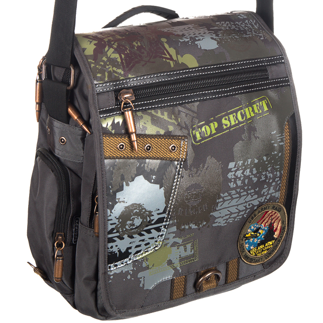 Дизайн в стиле "милитари" делает сумку ACHTUNG WOLF выбором мужественных и уверенных в себе личностей. Модель сшита из прочного и немаркого полиэстра неярких тонов, и отлично подойдет для повседневного ношения. Внутри имеются 2 отделения, карман на молнии; снаружи также расположено несколько карманов. Бегунки молний выполнены в виде патронов, подчеркивающими общий внешний вид эффектными штрихами.