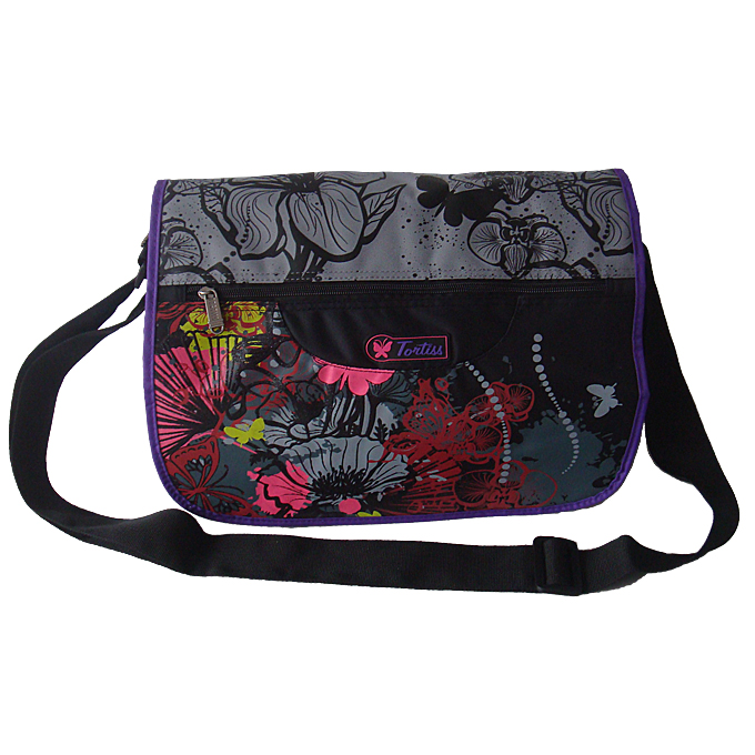 Сумка имеет два основных отделения на молнии, закрывающееся клапаном.В передней стенке клапана карман на молнии.Внутри сумки есть потайной карман на молнии и отделения под пишущие принадлежности. Передний клапан украшен шелкографией. На задней стенке имеется карман на молнии. Сумка имеет длинный плечевой ремень шириной 40мм, ремень регулируется по длине. Имеется короткая ручка.