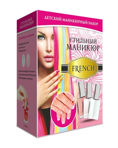 В комплект входит: o o Прозрачный лак o Розовый и белый лак o Комплект 3D наклеек o Аппликация из страз o Маникюрная палочка o Набор страз ассорти