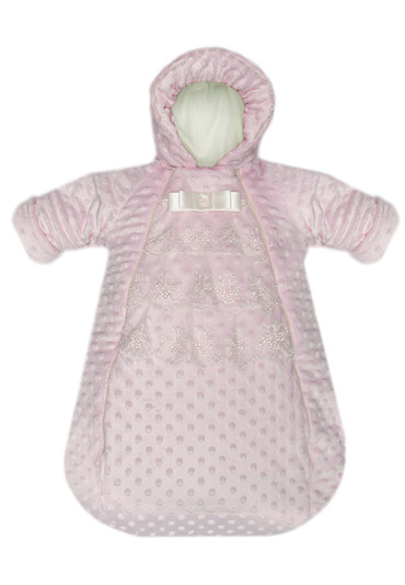 Верх из нежного вельбоа, подкладка трикотаж 100% хлопок Утеплен синтепоном плотностью 100 Две вертикальные молнии для большего удобства Плотно прилегающий капюшон на резиночке Украшен рюшами и атласным бантом, по настоящему торжественный!
