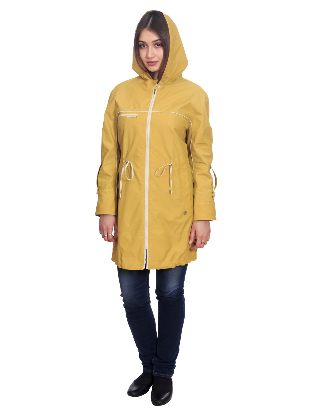 863 Ветровка из х/б ткани. Прямого силуэта, с цельнокроеным рукавом. Длина рукава регулируется отворотом и патой на пуговице. С капюшоном. Застежка на молнию. Объем по линии талии фиксируется кулиской. По линии кокетки проложен кант из отделочной ткани. Рамки под молнию, шнур кулисы из отделочной ткани. Ветровка подойдет на несколько размеров. Рекомендована в размерах от 46 до 60. Длина по спинке 86 см.