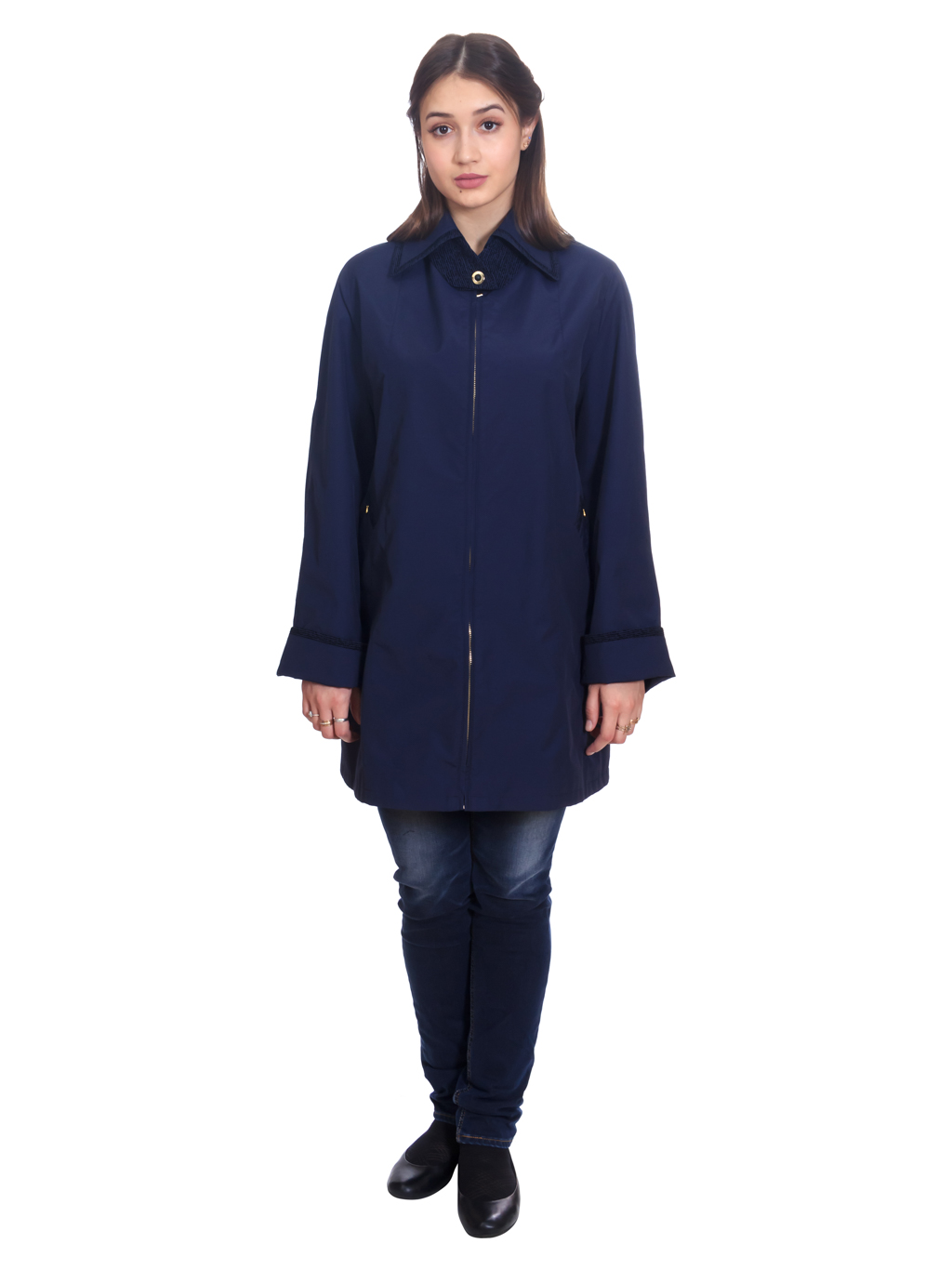 890 Ветровка на подкладке прямого силуэта с втачным рукавом. Застежка на молнии. Воротник отложной с кантом из отделочной ткани - флок в тон основной ткани. Карманы в листочку. На карманах отделка аналогичная воротнику. По горловине ветровки отделочная деталь, застегивающаяся на декоративную пуговицу. Модель для женщин, предпочитающих классическую форму. Ткань флок, использованная в качестве отделки, популярна в новом сезоне. Рекомендована в размерах 48-60. Длина по спинке 87 см.