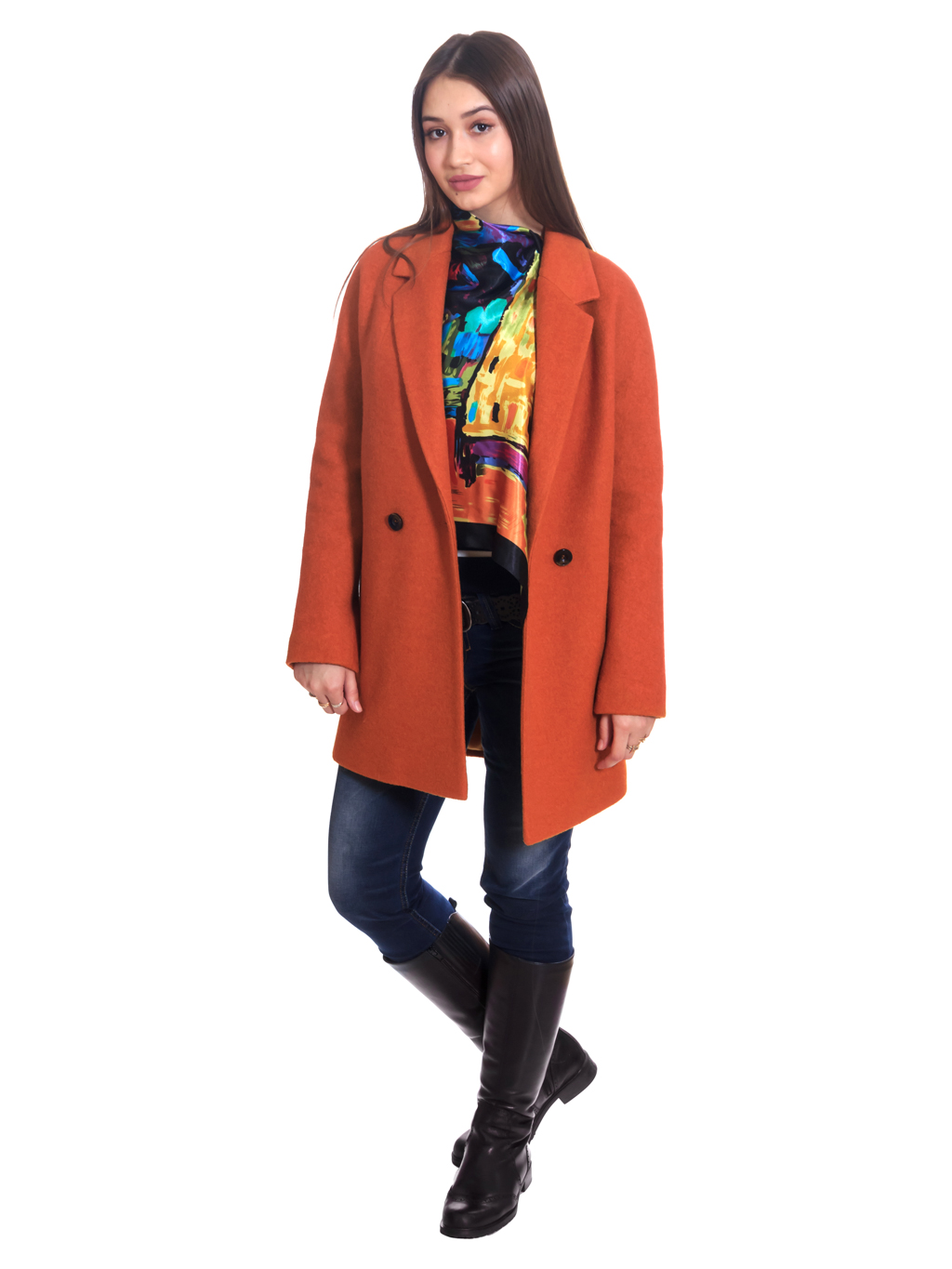 Полупальто прямого силуэта рубашечного покроя рукава, воротник отложной с отворотами лацканов, карманы в рамку. Застежка центральная на одну пуговицу. Длина по спинке 77 см.
