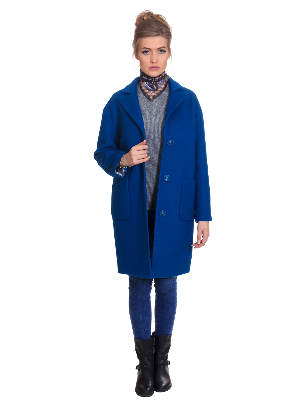 Пальто прямого силуэта, зауженное к низу, на полочке рельефы, из релефов выходят нагрудные вытачки. Рукав со спущенной проймой.Воротник отложной с отворотами лацканов. Застежка центральная на три пуговицы. Карманы накладные с закругленными краями. Длина по спинке 90 см.