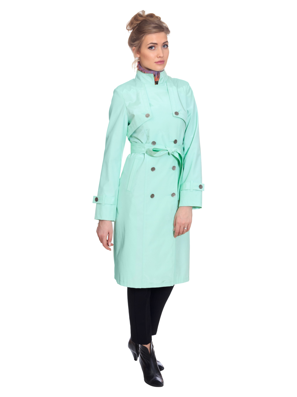 828 Плащ <<тренч>> с отлетными кокетками. Двубортный.Застежка на пуговицы. Приталенный с вертикальными рельефами, выходящими из плечевого шва. Рукав втачной с патами по низу рукава. Воротник стойка в застегнутом виде. В расстегнутом - отложной с лацканами. Карманы в листочку. Пояс завязывающийся. Рекомендован в размерах от 44 до 52. Длина по спинке 105 см.