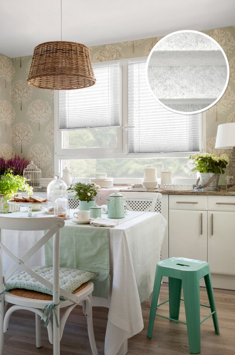 В отличие от других видов штор, конструкция штор плиссе имеет меньший вес, компактнее и лучше всего позволяет избежать провисания материала, что незаменимо для наклонных потолочных окон, для открывающихся окон.