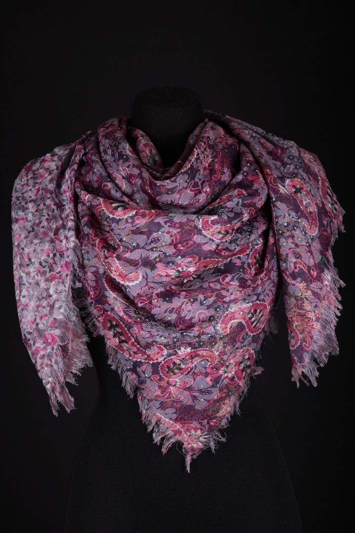 Абсолютная новинка на Российском рынке, эксклюзивная разработка наших дизайнеров - платок 2 в 1 изготовлен из равных частей хлопка и вискозы. В развернутом виде платок имеет форму ромба. Изготовлен по новейшей технологии, включающей в себя три этапа, каждый из которых сам посебе уникален : 1. Нанесение двусторонней трансферной печати. 2. Вытравка узора на ткани. 3. Нанесение "золотого" тиснения поверх рисунка. Слияние этих технологий позволило получить изделие, аналогов которому на сегодняшний день нет.