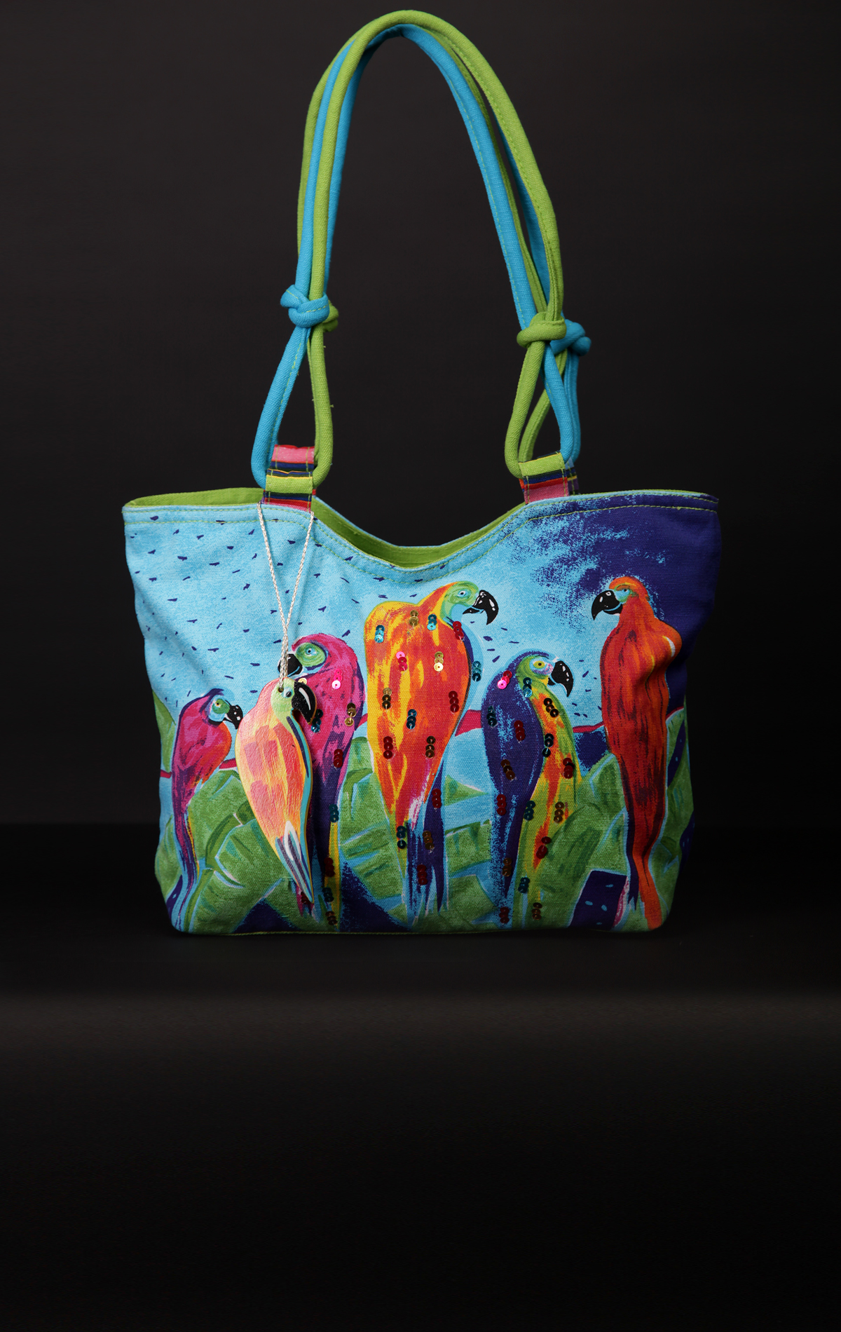 Городская сумка оригинального дизайна, закрывающаяся на "молнию". Изготовлена из 100% хлопка с влагоотталкивающей пропиткой. Сумка украшена декоративными элементами в виде пайеток. Внутри имеется карман на "молнии", кармашек для телефона и твердое донышко. На сумке брелок из дерева с ручной росписью. Сделано в Индии.