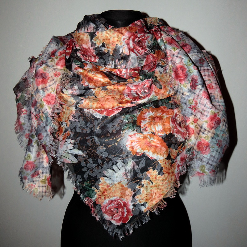 Абсолютная новинка на Российском рынке, эксклюзивная разработка наших дизайнеров - платок 2 в 1 изготовлен из равных частей хлопка и вискозы. Изготовлен по новейшей технологии, включающей в себя три этапа, каждый из которых сам по себе уникален : 1. Нанесение двусторонней трансферной печати. 2. Вытравка узора на ткани. 3. Нанесение "золотого" тиснения поверх рисунка. Слияние этих технологий позволило получить изделие, аналогов которому на сегодняшний день нет.