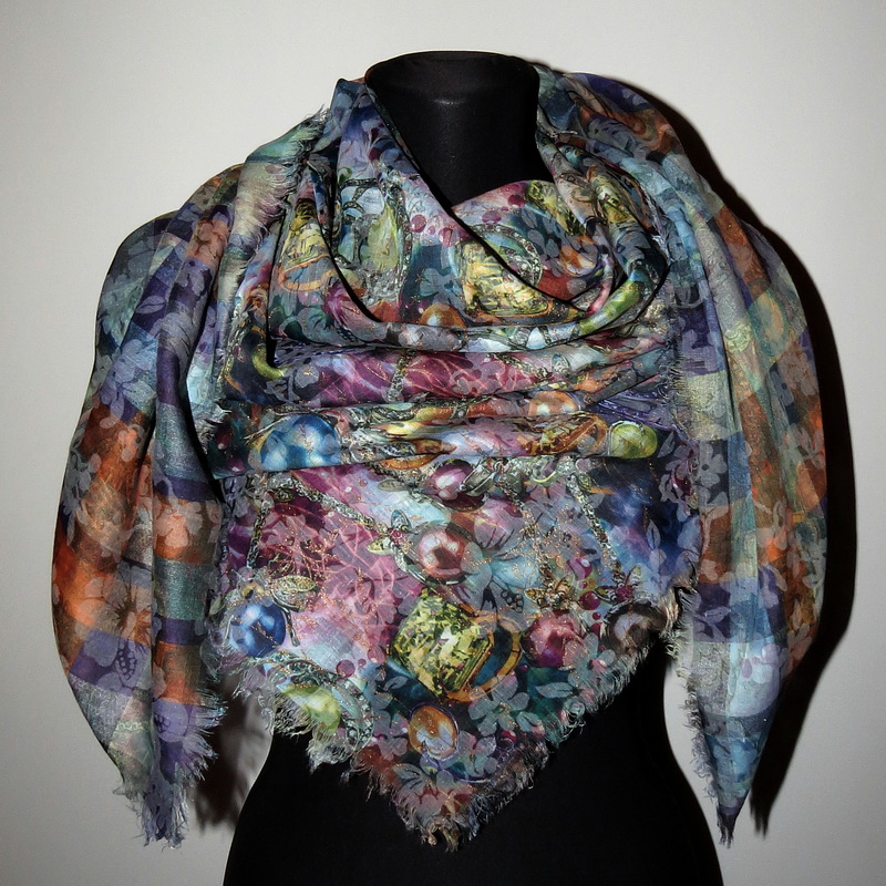 Абсолютная новинка на Российском рынке, эксклюзивная разработка наших дизайнеров - платок 2 в 1 изготовлен из равных частей хлопка и вискозы. Изготовлен по новейшей технологии, включающей в себя три этапа, каждый из которых сам по себе уникален : 1. Нанесение двусторонней трансферной печати. 2. Вытравка узора на ткани. 3. Нанесение "золотого" тиснения поверх рисунка. Слияние этих технологий позволило получить изделие, аналогов которому на сегодняшний день нет.