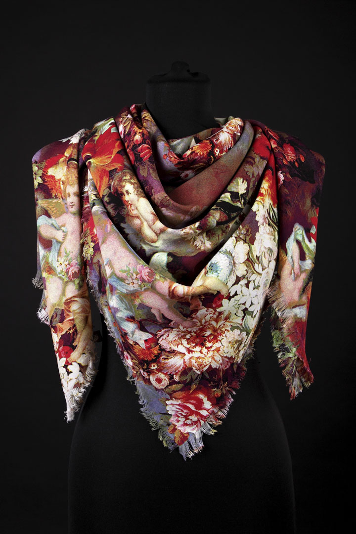 Роскошный платок изготовлен из тяжелого китайского шелка напополам с мерсерезированным хлопком. Тяжелая шелковая структура, яркие краски, малая сминаемость и прекрасная драпируемость - вот неполный перечень свойств, которые делают данное изделие универсальным дополнением к любому гардеробу.
