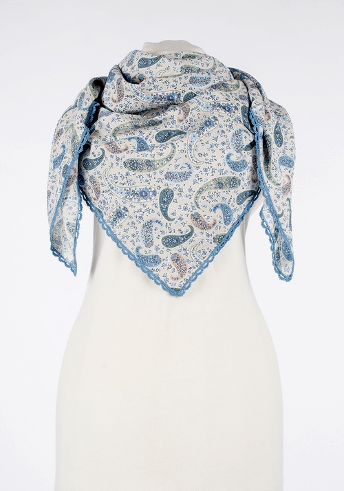 Платок изготовлен из 100% мерсеризированного хлопка. В процессе мерсеризации хлопок приобретает следующие свойства: повышенную гигроскопичность, шелковистый блеск, повышенную прочность. Изделия из мерсеризированного хлопка меньше мнутся, не выцветают и не линяют, не дают усадки при стирке, очень комфортны и приятны на ощупь.