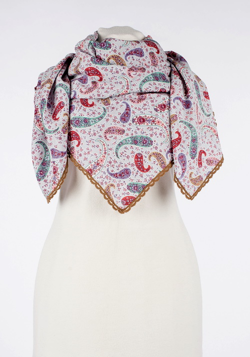Платок изготовлен из 100% мерсеризированного хлопка. В процессе мерсеризации хлопок приобретает следующие свойства: повышенную гигроскопичность, шелковистый блеск, повышенную прочность. Изделия из мерсеризированного хлопка меньше мнутся, не выцветают и не линяют, не дают усадки при стирке, очень комфортны и приятны на ощупь.